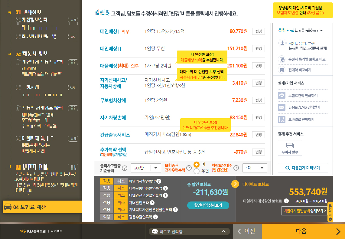 그 리스트들에 일일이 들어가서 조건 설정하고 보험료 산출 받아 보시면 됩니다.