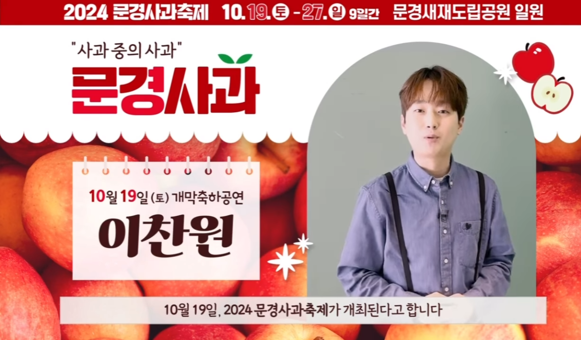 꿀사과로 유명한 문경에서 문경사과축제가 열립니다. 진또배기 이찬원,마이진,박지현등 다양한 트롯 가수들이 초청되어 공연도 펼치고 유명한 문경사과 판매 및 행사도 진행한다고 하는데요. 맛있는 사과를 산지에서 구매하시길 원하시는 분이나 지역 부민분들은 관심을 가지면 좋은 소식같습니다.